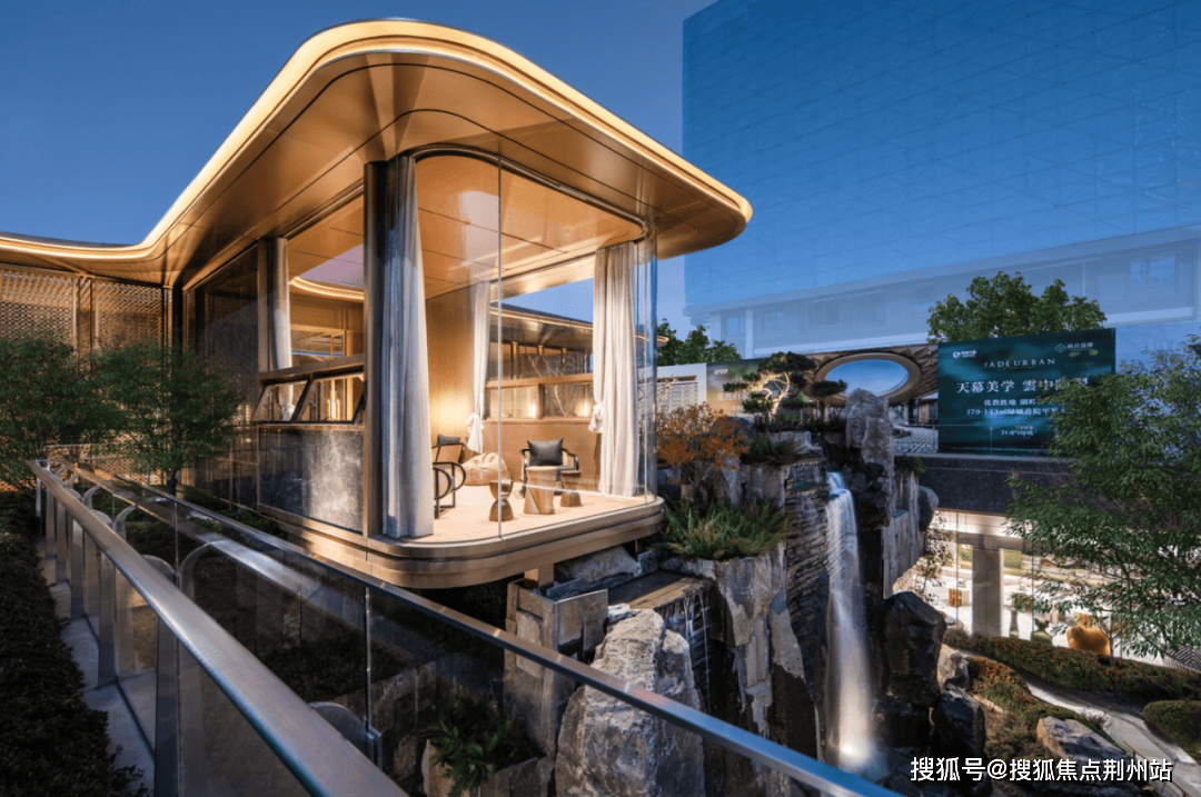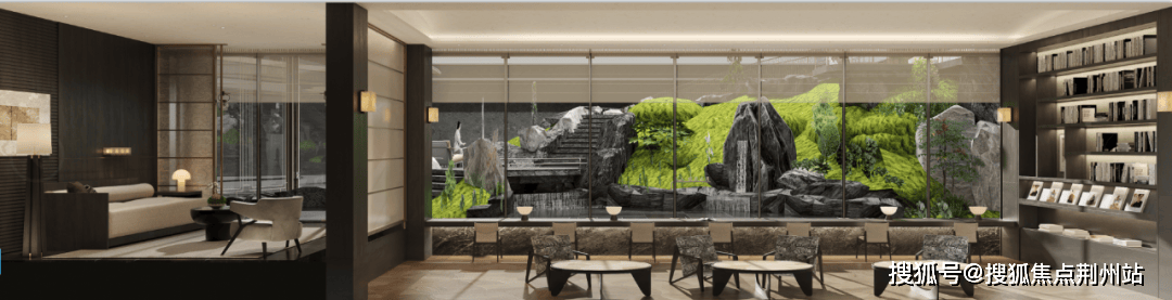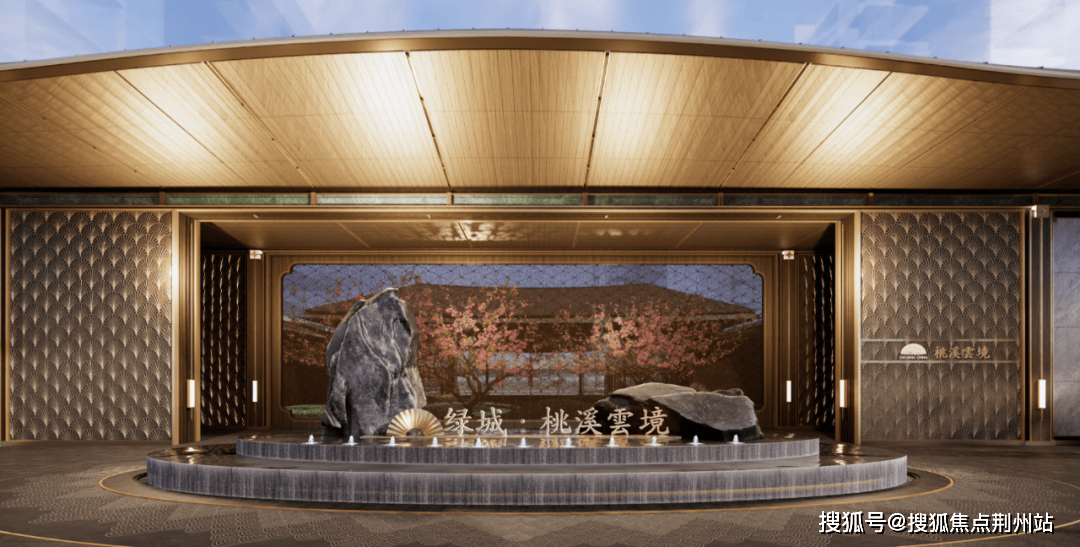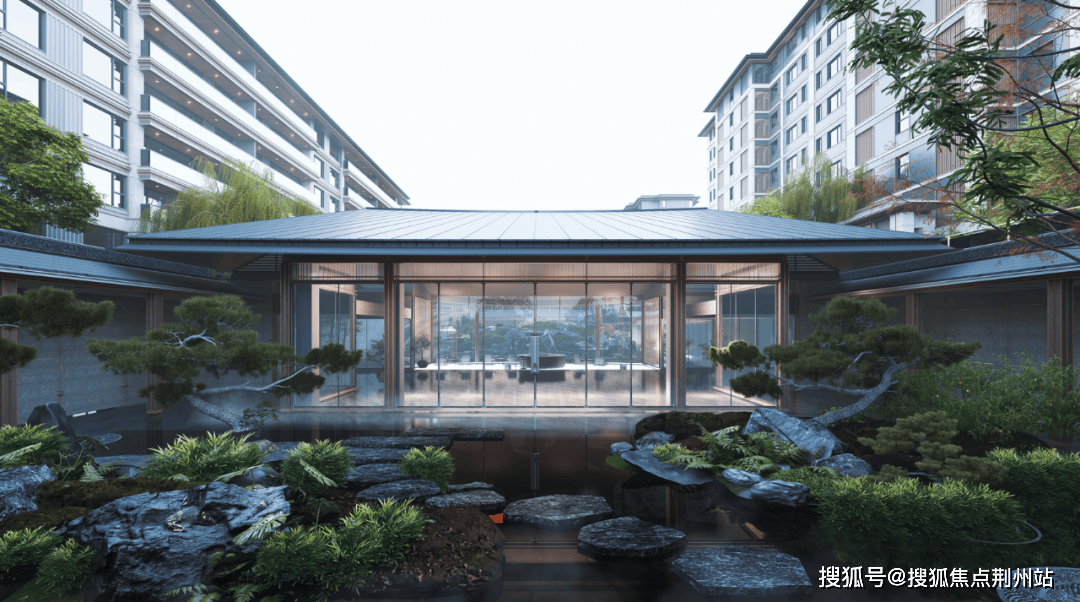 售楼处前后两处下沉庭院,将江南园林的写意挥洒自如,迎宾庭院主打礼序与规制,镜面水景将视线和情绪一同“收敛“,释放出静谧、安定的环境语言,完成归家的心境切换。