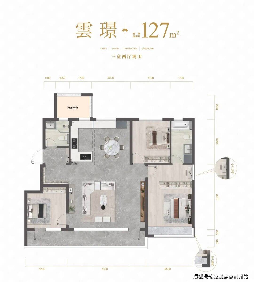 洋房127m²三室户型,客厅开间约6.1米,厨房是开敞型设计,餐厅可摆放圆桌,给予充足的社交空间。阳台面积达到约12m²,为使用场景留足想象空间。折合赠送面积,整体得房率接近95%。