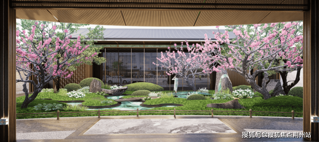 方正的大门如同一幅画框,将中庭花园“裱”成了一幅山水,浓墨重彩的描绘出一幅“渔舟逐水爱山春,两岸桃花夹古津”的诗意画卷。“以画入景”这四个字,在这里有了具象的表达。