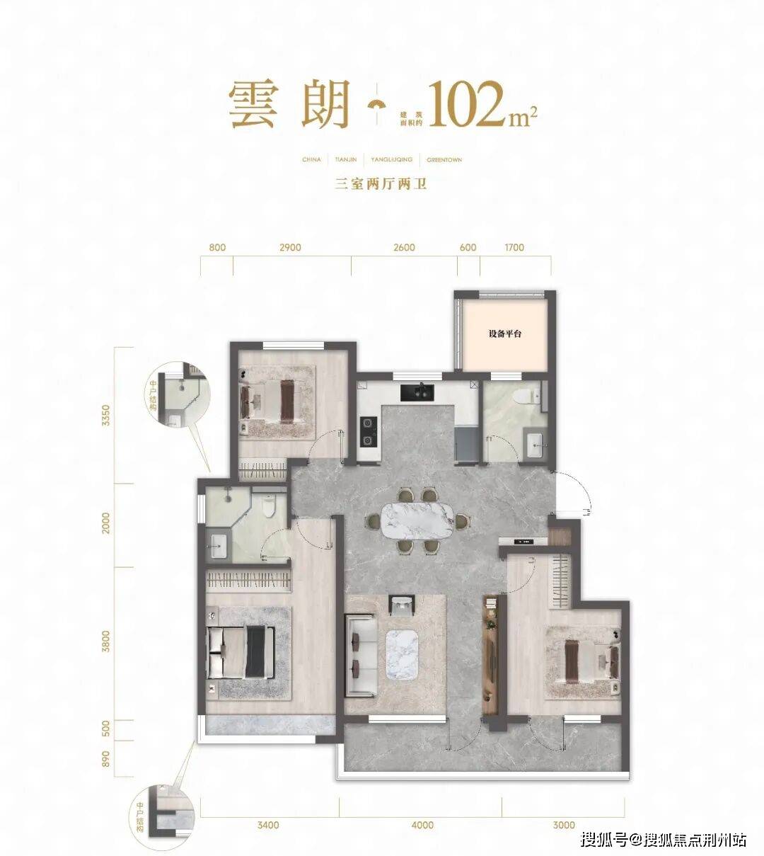 洋房102m²三室户型,最大得房率可到约90%,玄关处有独立的收纳空间,客卫连接的设备平台可以改造成家政间,南向阳台横跨客厅和次卧,主卧飘窗视野开阔,端户位置更升级为转角飘窗,尽享景观最大化体验。