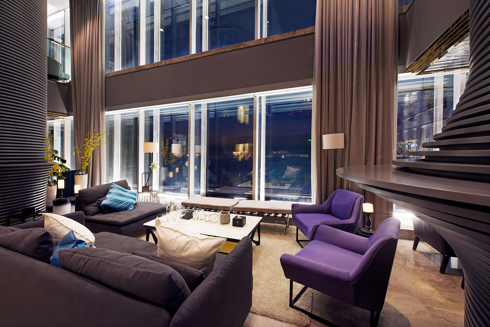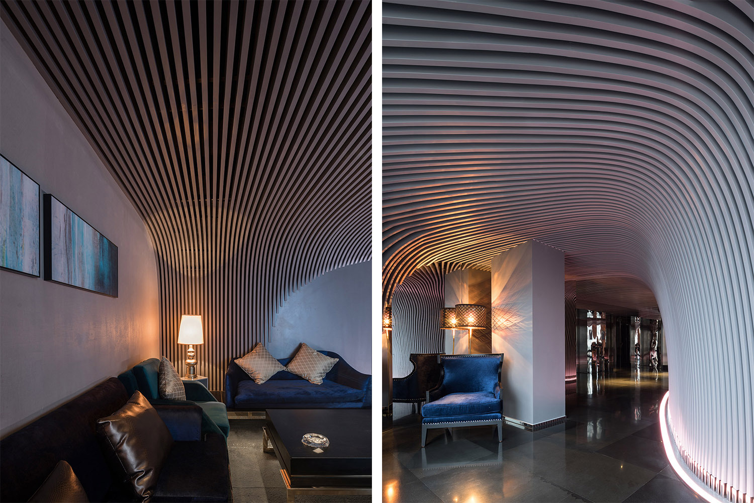 七层与八层是专属于V+ Lounge VIP的独享空间,设计语言与其他空间相统一,但却更为尊贵与奢华。沿西湖面的两层空间部分被上下打通,形成一个中空的空间,既交相呼应又独立分隔,并将水的语汇元素用现代的方式展示在空间中。