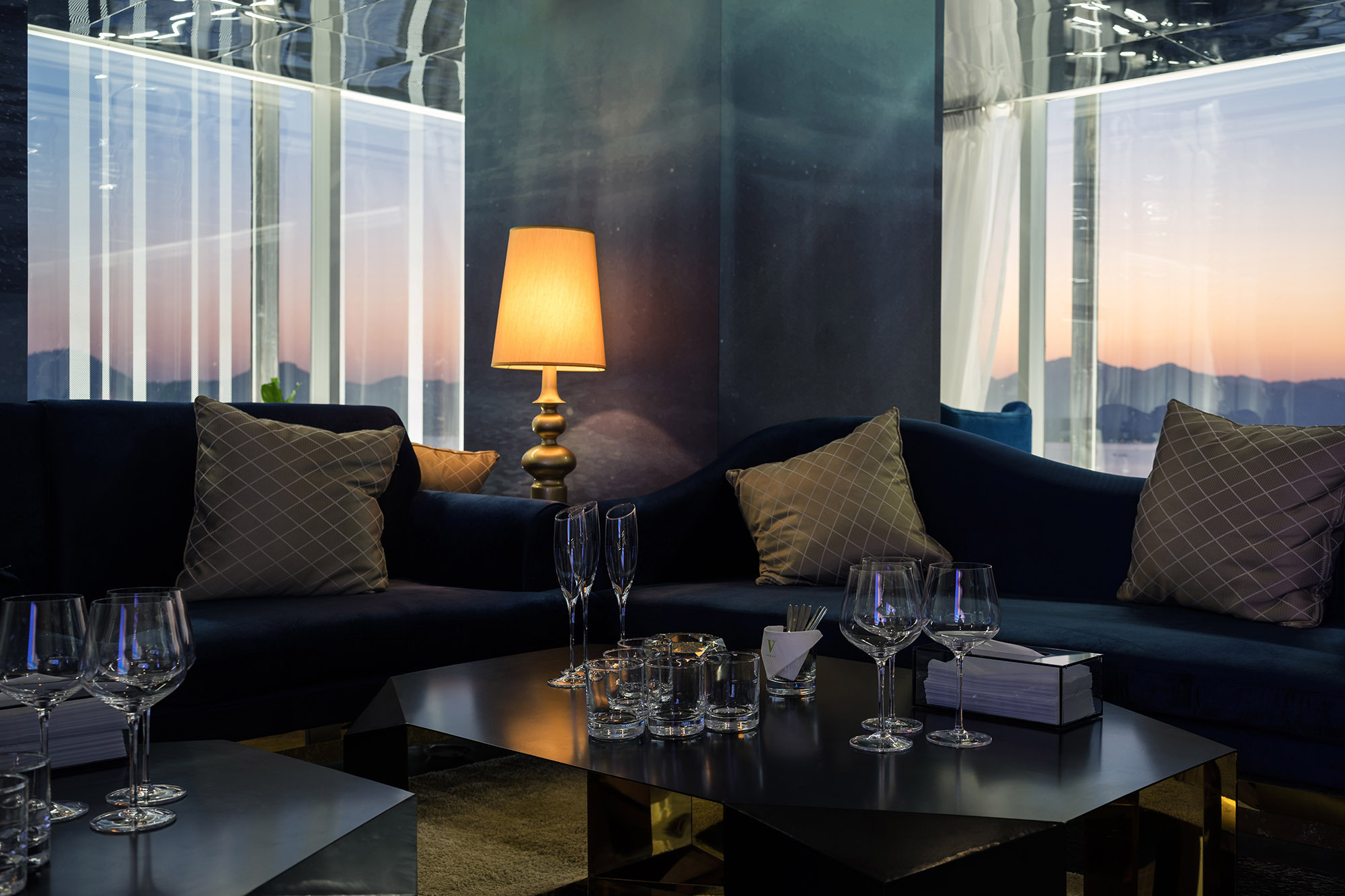 为体现湖面轻盈的光影和富有微妙细腻的动感,七层整体空间采用了厚重精致的材料,,从而体现出水面的斑驳之感。吧台区域的设计以玻璃和金属材质为主,结合穿插于玻璃中间的灯光,营造出一个发光的宝石的效果。使得整体吧台成为一个视觉焦点。在散客区,椭圆形片状物包裹柱体,可以在合适的高度形成桌面,带来独特的餐饮体验。沿窗的区域设置了可灵活组合的桌椅,中性的暗色调空间更加凸显出窗外抢眼的西湖夜景。