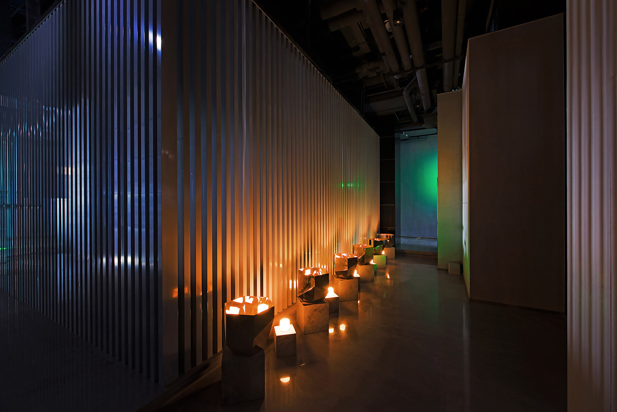 八层整体空间延续七层的材质对比的做法,但在空间造型上使用具有序列感且对称的线条元素,以区别于七层的自由排列的几何线条。在VIP室内,天花由银白色的金属插片与质感较为厚重的混凝土组成,强调了材料的厚重与轻盈、多元与整体。地面部分选用暗色调的石材结合金属线条拼接。厚重的暗色调材质更能够凸显出银白色金属插片的轻盈感。