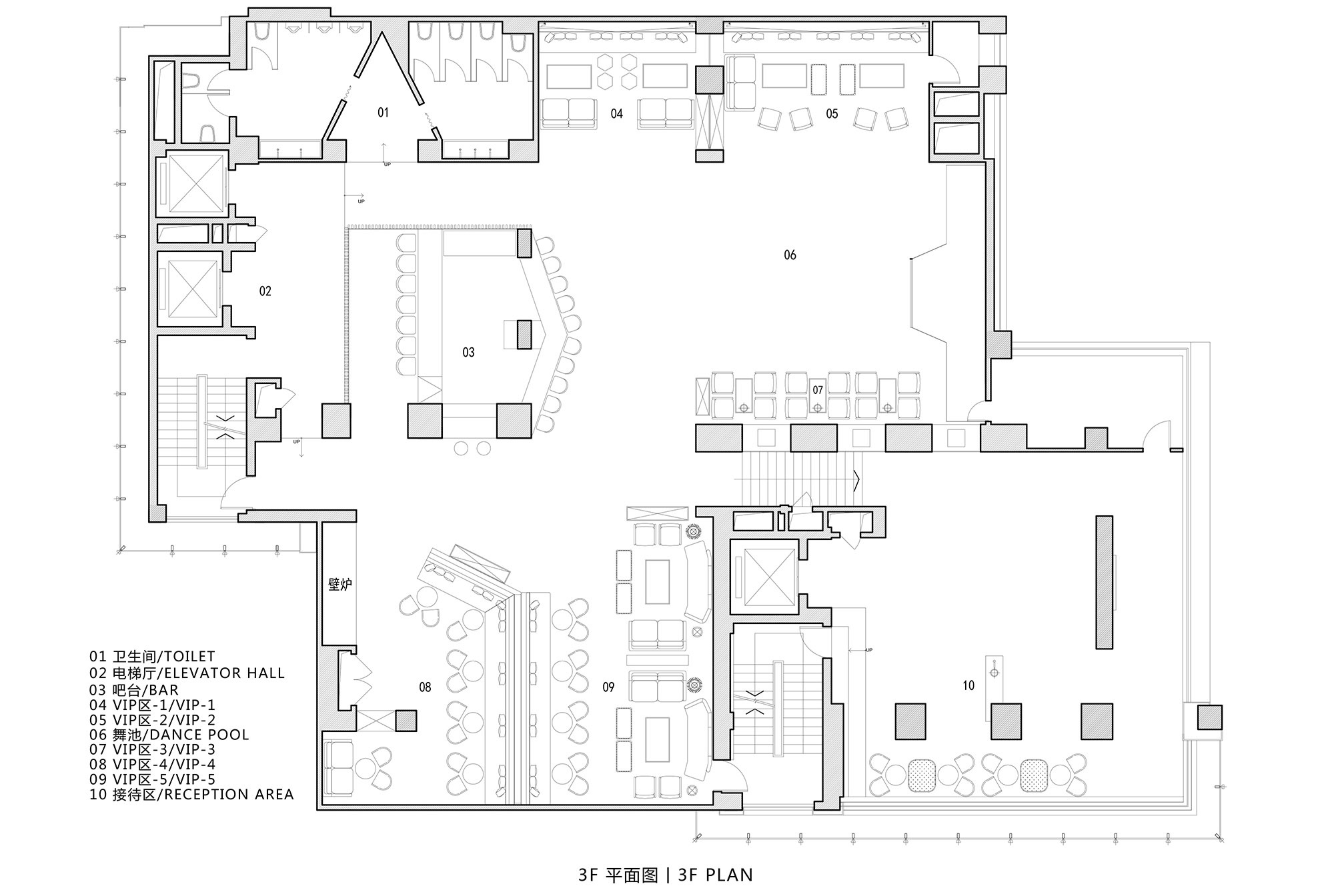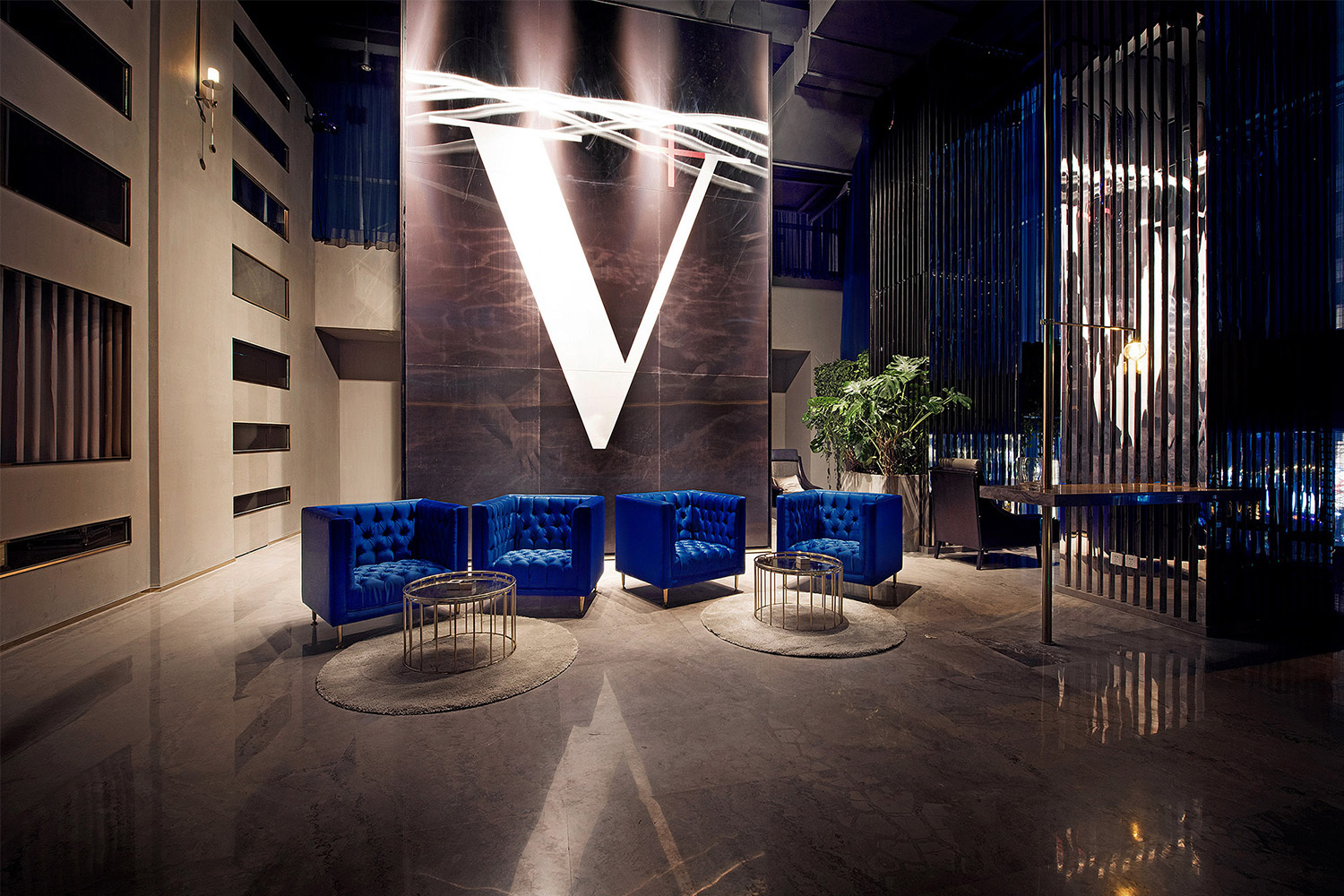 三层是综合性酒吧,设置了多种类型的吧台,以满足不同顾客的需求。休息区正中间耸立着黑白大理石拼接的巨大V+ logo,Logo图案在不同的视角下面会产生不同的变化。大理石墙面经过点光源的反射,将层高的优势通过戏剧化的材质表现方式进行解构和重组。