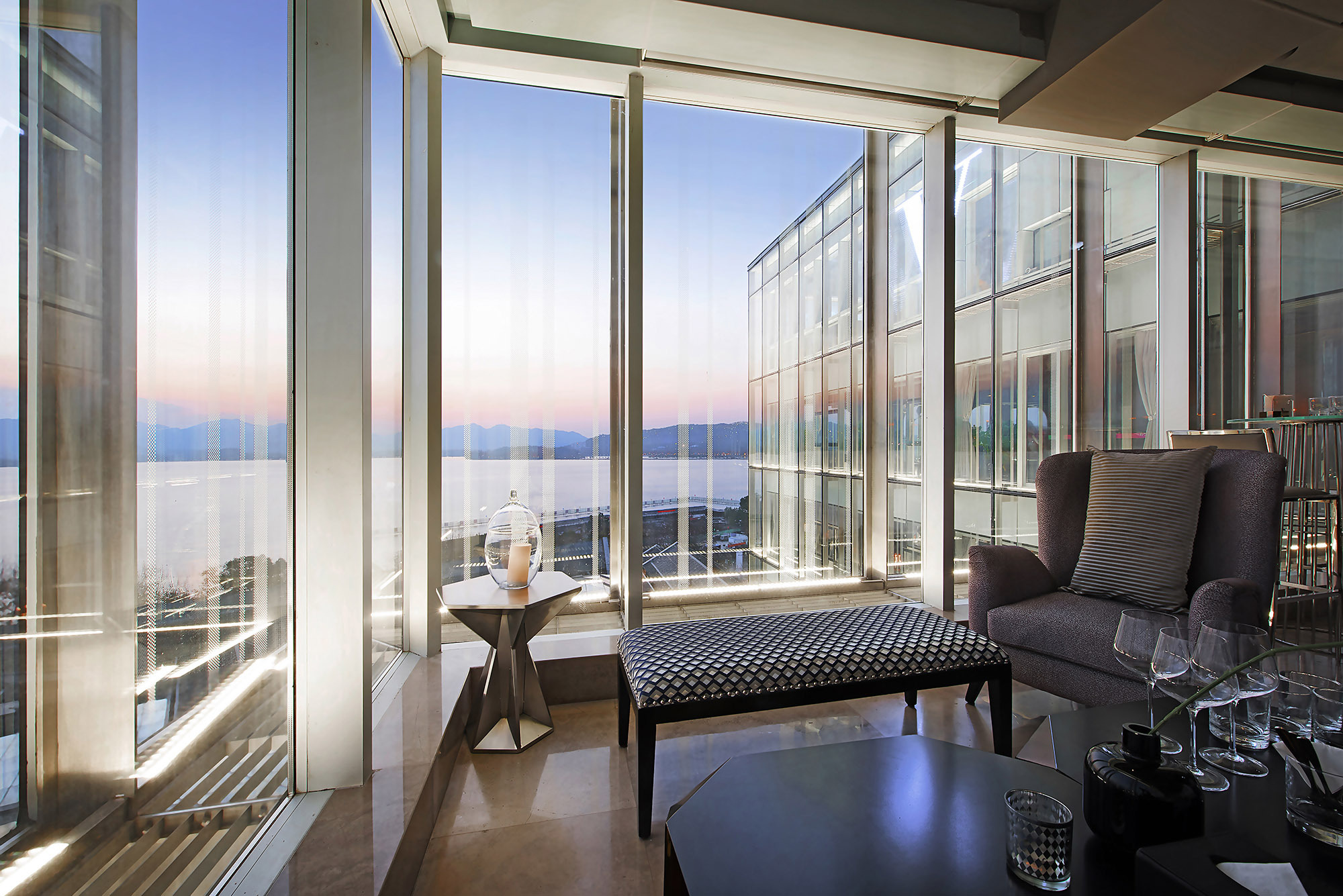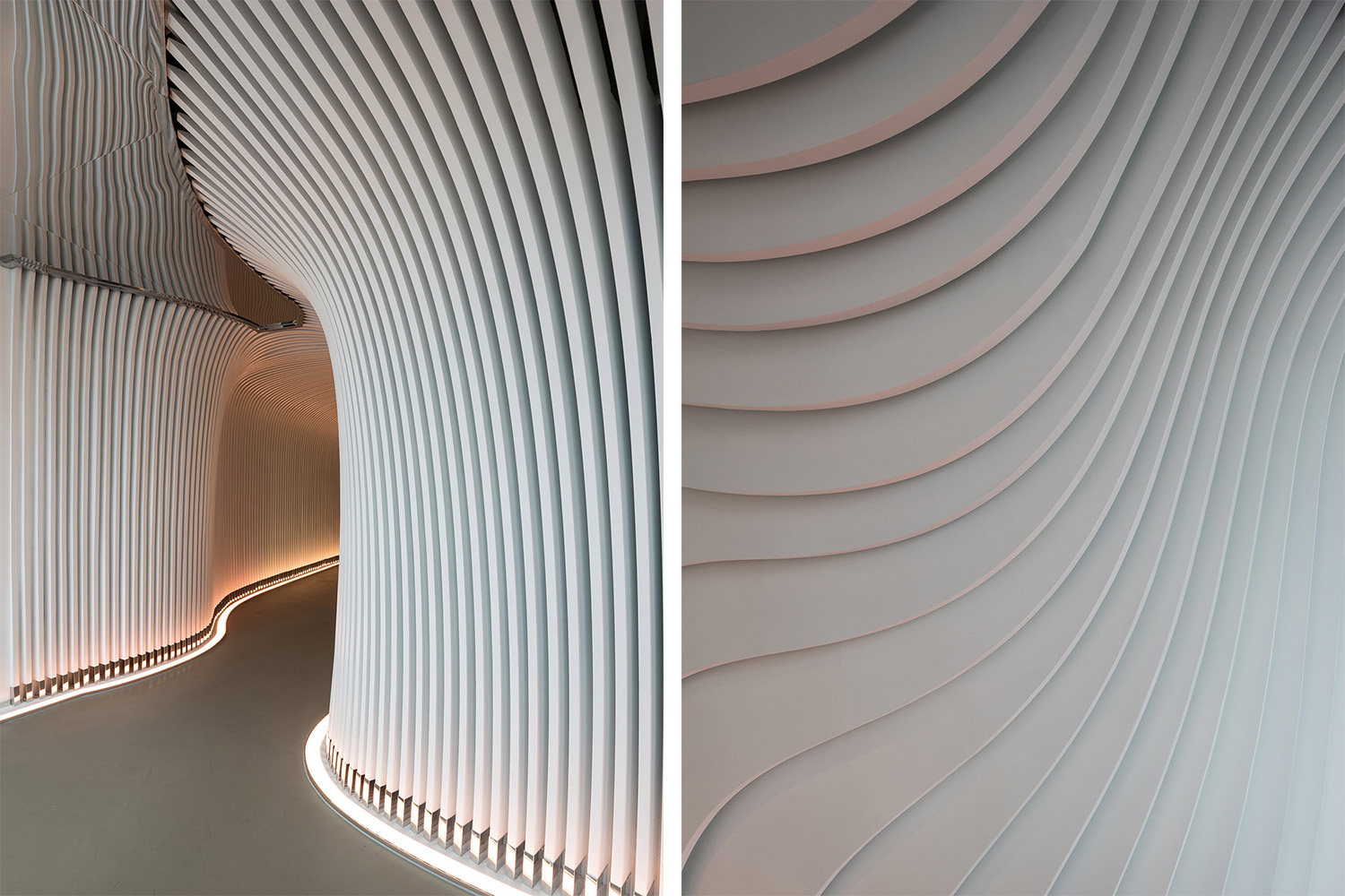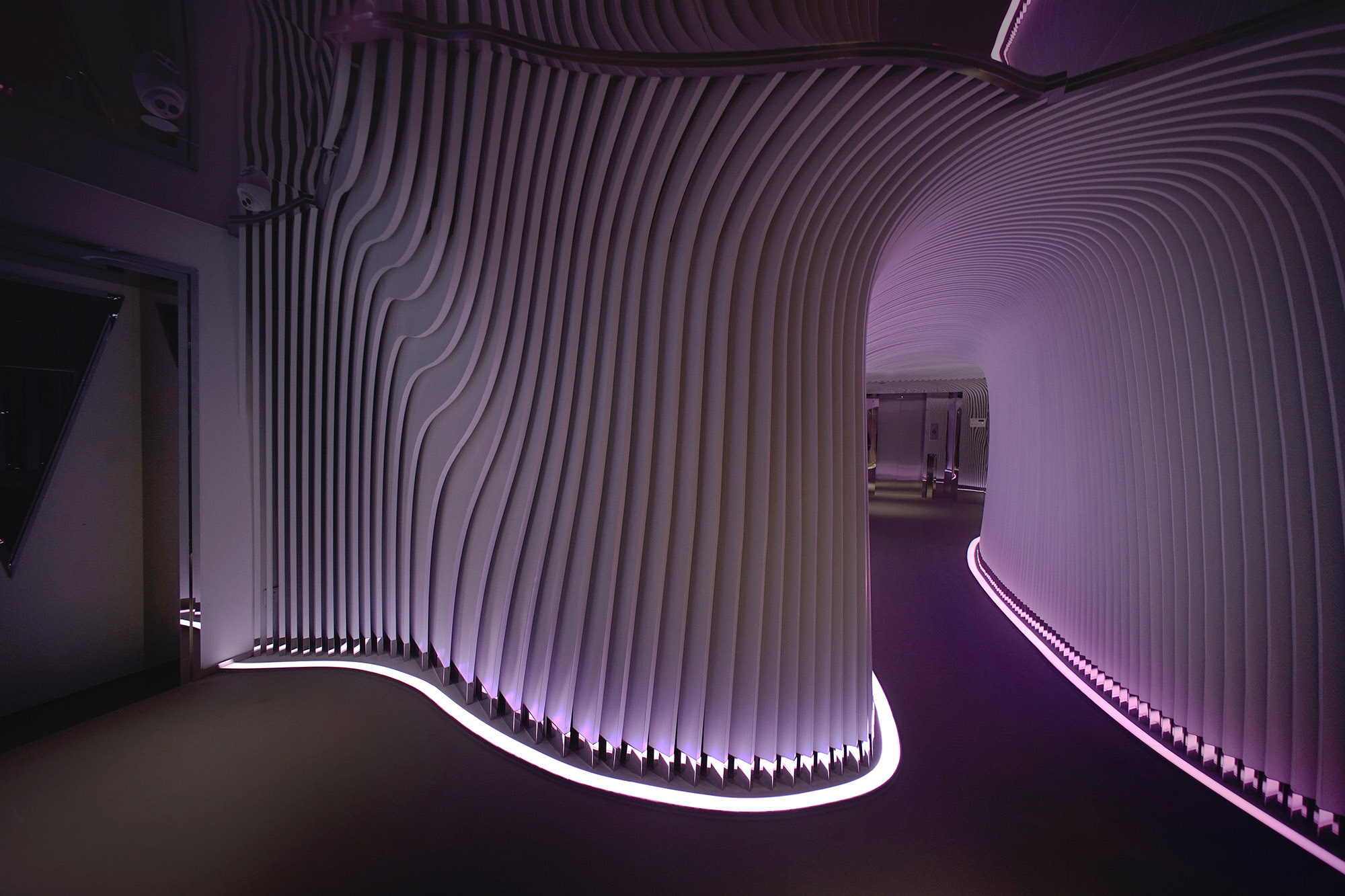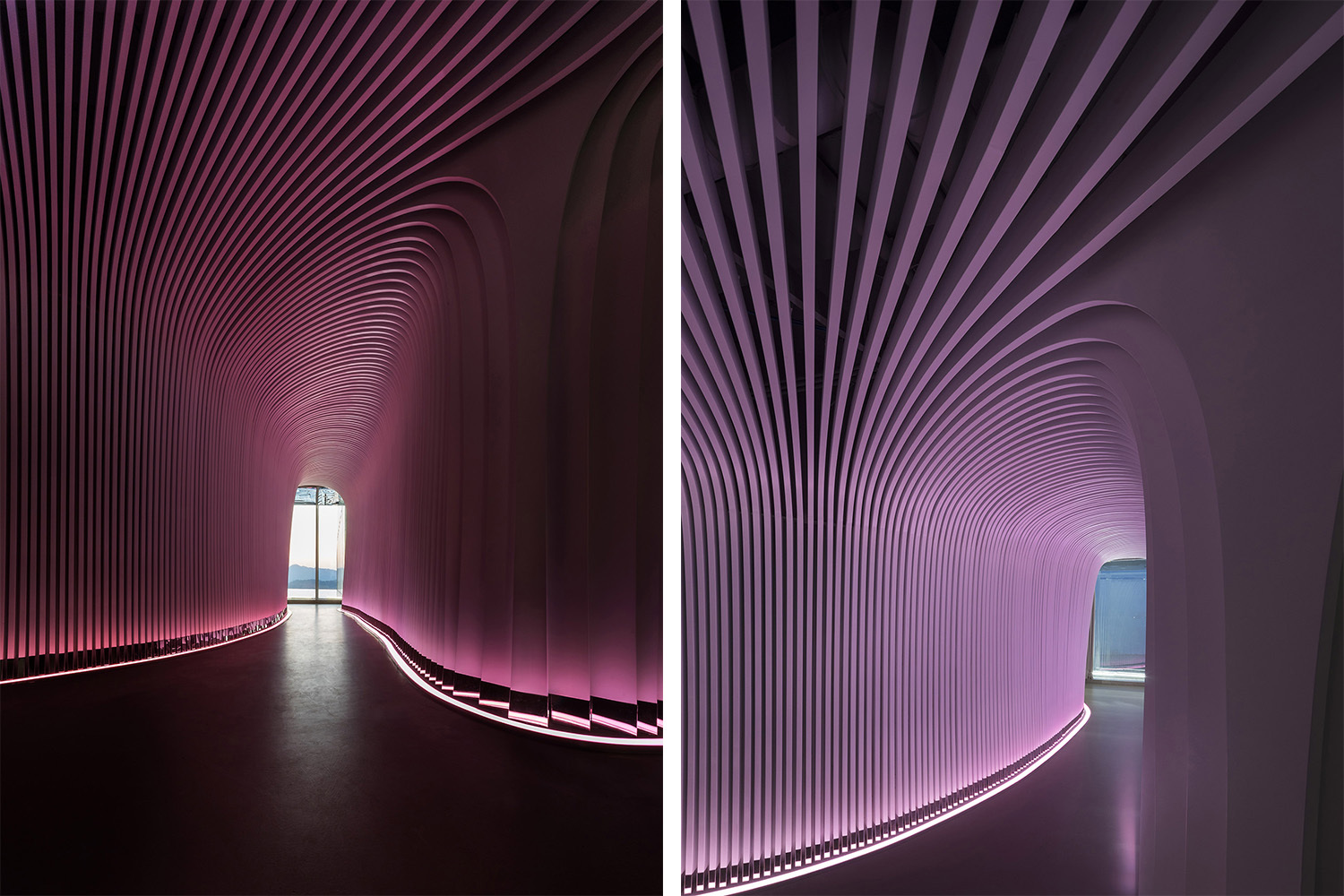 六层空间引入了无限西湖的概念,空间内沿用了白色的流线型墙体,并与镜面材料无缝连接,纯净而明快。整个空间简约而动感,宛如西湖水面一叶扁舟划过后留下的优美曲线。夹在水波之中的廊道运用高反射材料,将西湖美景延伸进室内空间,与室内天花映射出的美景形成鲜明的反差。廊道周围散射灯的带型可变色光源,呈现波光的柔美感觉,使人宛如身处湖底。