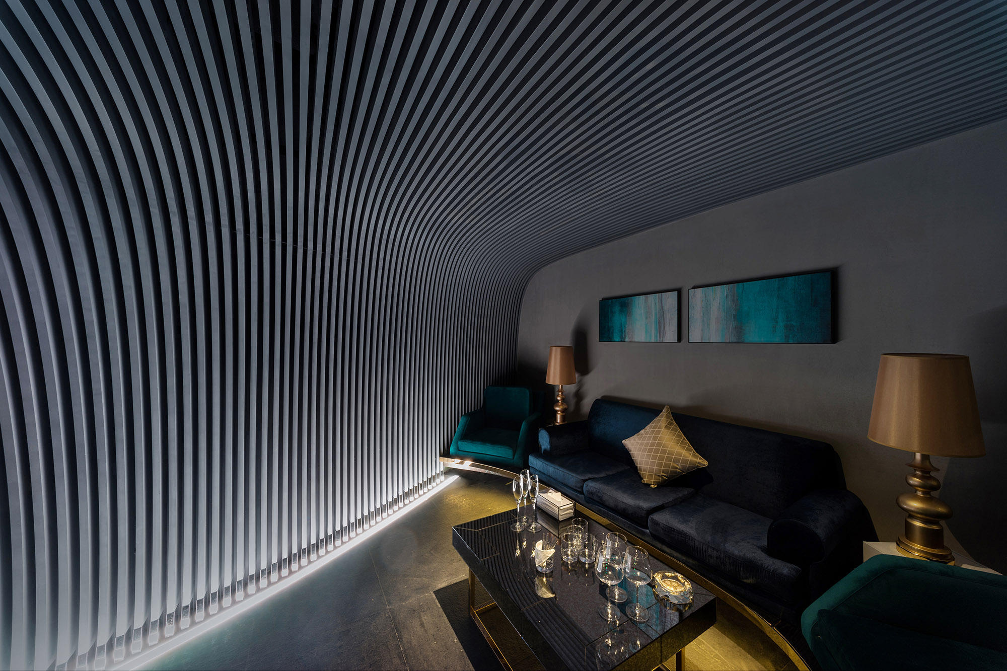 酒吧着重营造水下空间氛围。设计师使用透明的水纹玻璃作为墙面,顶部设置了射灯和漫反射灯光,利用空间的纵深优势,打造了一个虚实相交的水下吧,在变换的灯光下,柔和的呈现四季交替的景象。