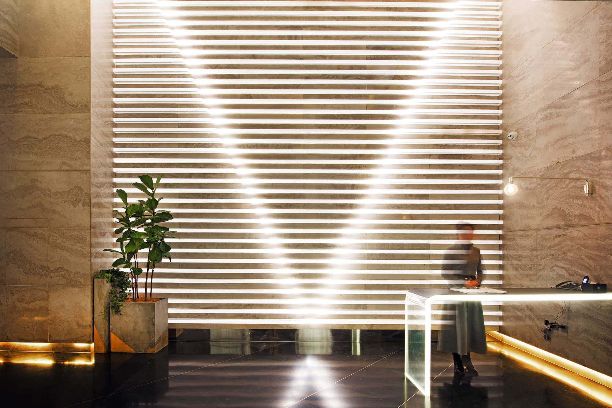 一层大堂利用层高较高的优势,运用较为整体的墙面设计,将若隐若现的几何分割光线穿插于其中,空间开敞、大气。细腻考究的材质暗示了整个项目低调、奢华的空间属性。