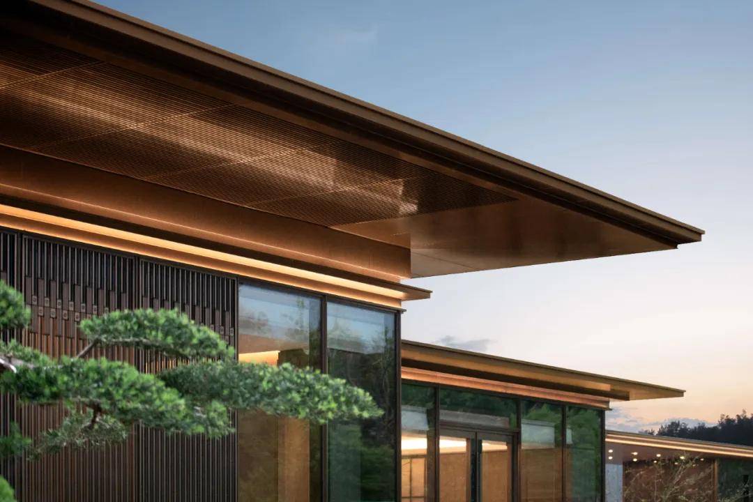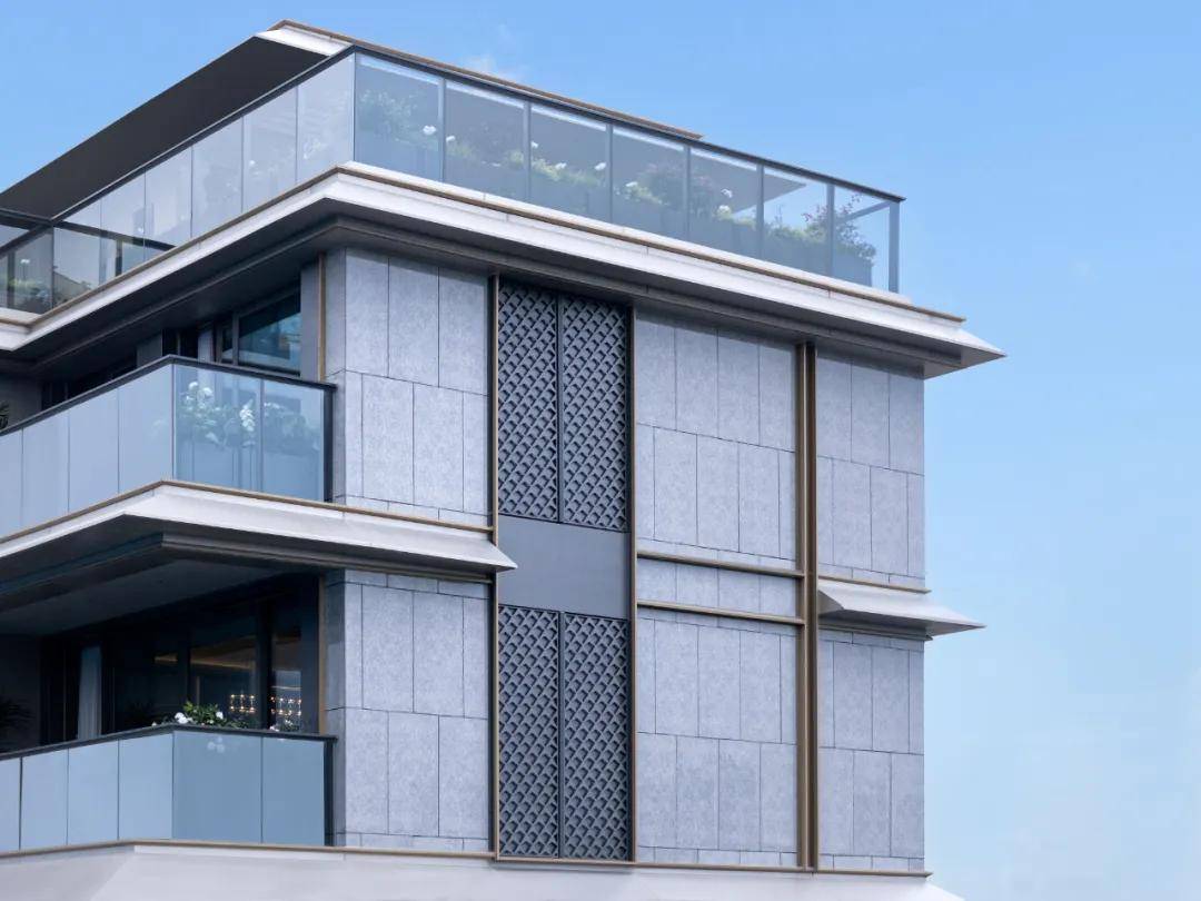 立面铝板搭配石材纹理的新型干挂材料,建筑立面质感升级;横向挑檐的置入,提升私密感。