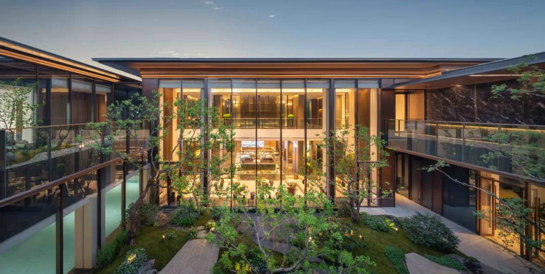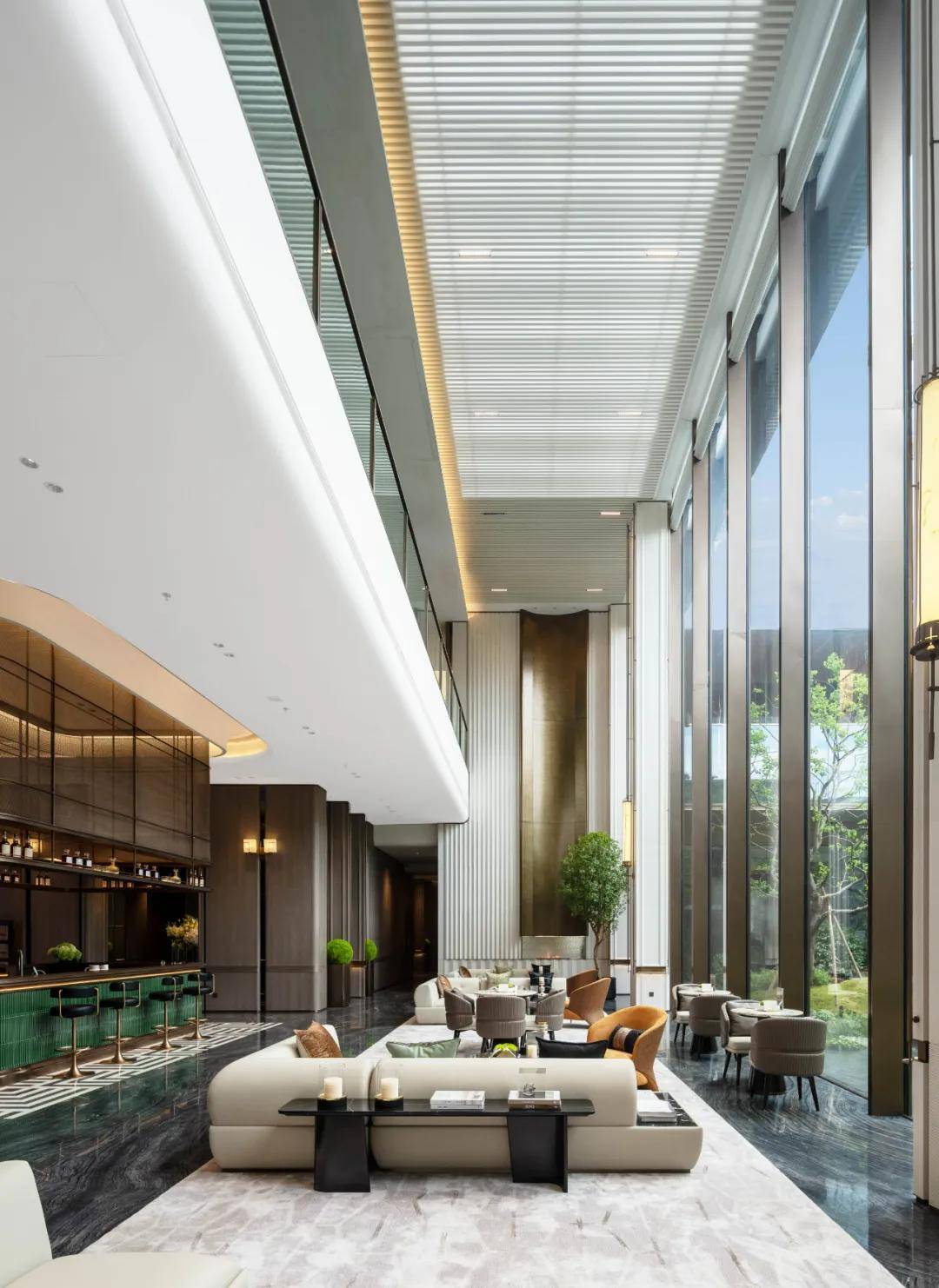 挑高区域采用了长达约10米的落地玻璃窗,整体营造了一个被园林美景包围的城市会客区。