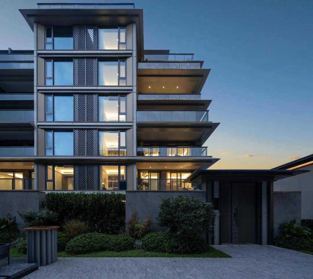 在项目入口的门头设计上,特别选用了普拉达绿奢石与黑松搭配,为建筑增添了隐奢的气质,精心打造的铜门和格栅为业主归家增添高雅的仪式感。