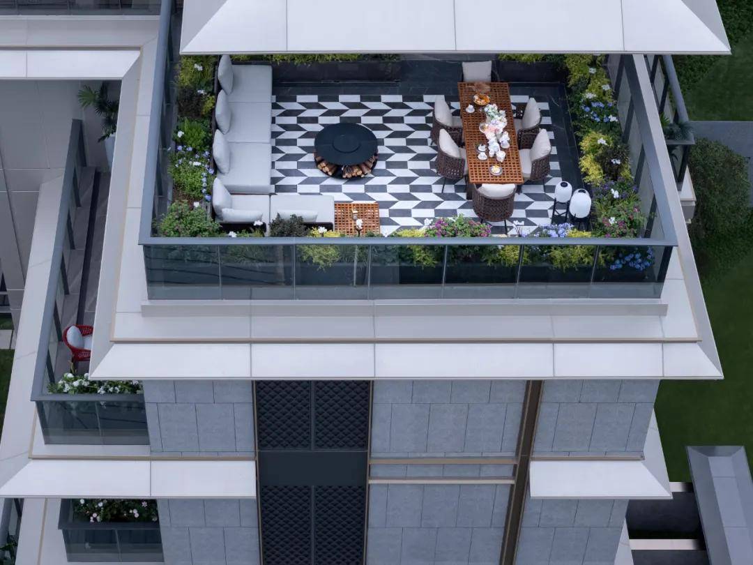 上叠建面约 218㎡户型配备屋顶花园,电梯直达,在这里,还可以看日出日落、仰望星空,享受宁静惬意生活。