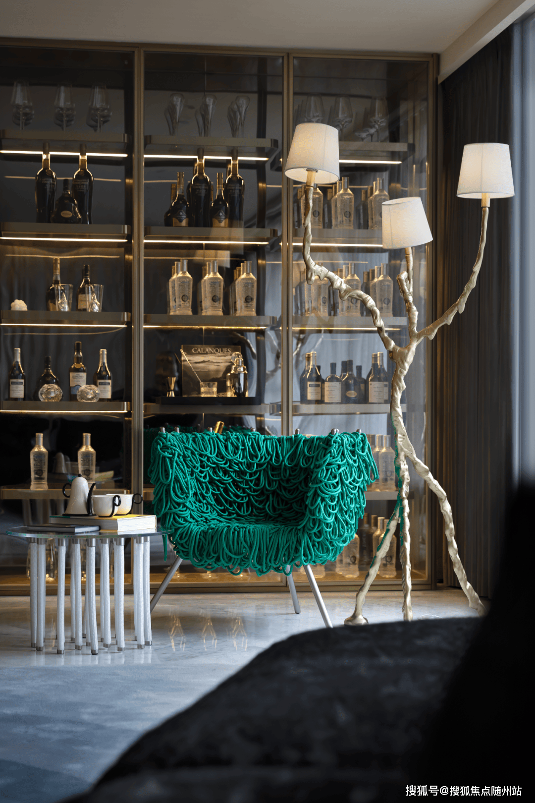 412㎡“行云”(邱德光设计):普拉达绿石材吧台、劳伦黑金奢石铺装,6.8米挑高观景台。