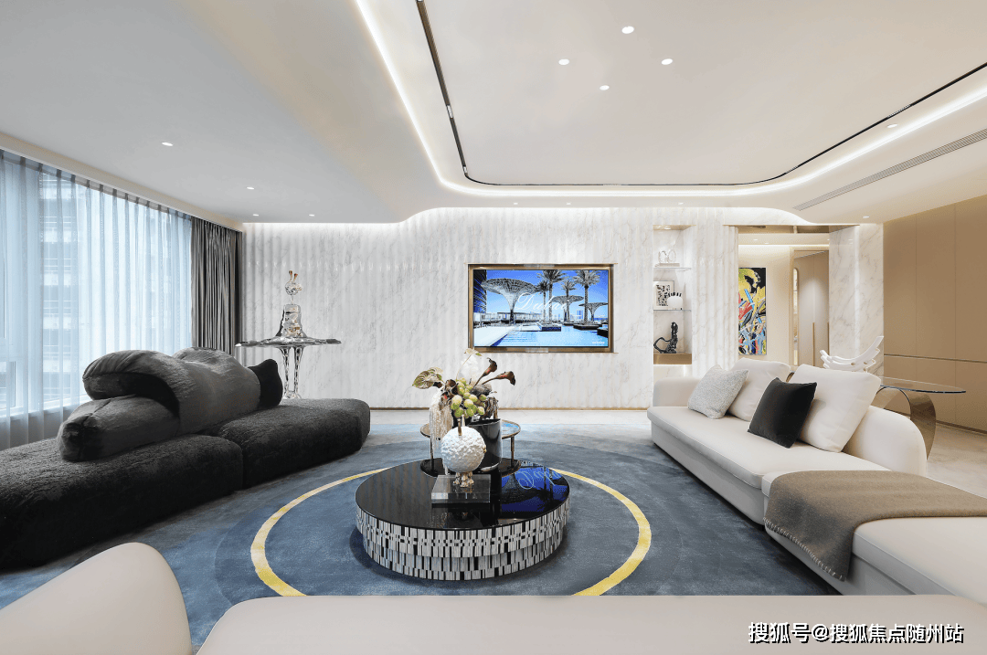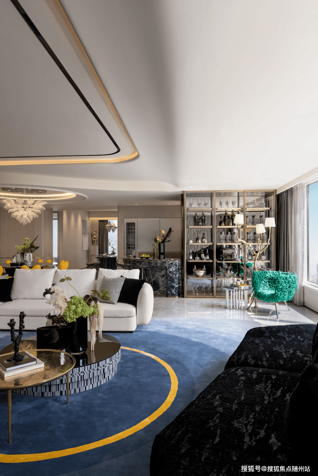 尤其是约412㎡“行云”,无论玄关处雪花白、劳伦黑金、金世纪的大胆拼花,瓦楞式的波浪形电视背景墙,还是吸睛的普拉达绿石材吧台,全屋随处可见出色审美和奢华材质的完美结合。