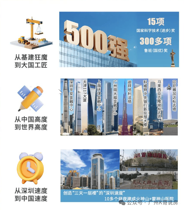 中建三局:全球最大的投资集团之一——中建集团旗下最具竞争力的优秀排头兵。参建50余座300米以上超高楼及8座摩天大楼,缔造“深圳速度”和“中国速度”建筑新奇迹。累计荣获15项国家科技进步奖,300余项鲁班(国优)奖。