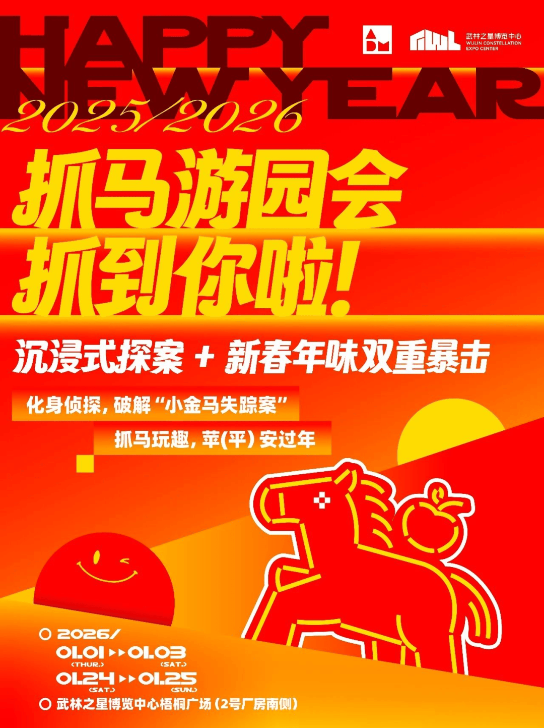 武林之星“抓马游园会-新春探案市集”:元旦沉浸式探案市集,参与集章任务,消费满额抽“足金小金马”。