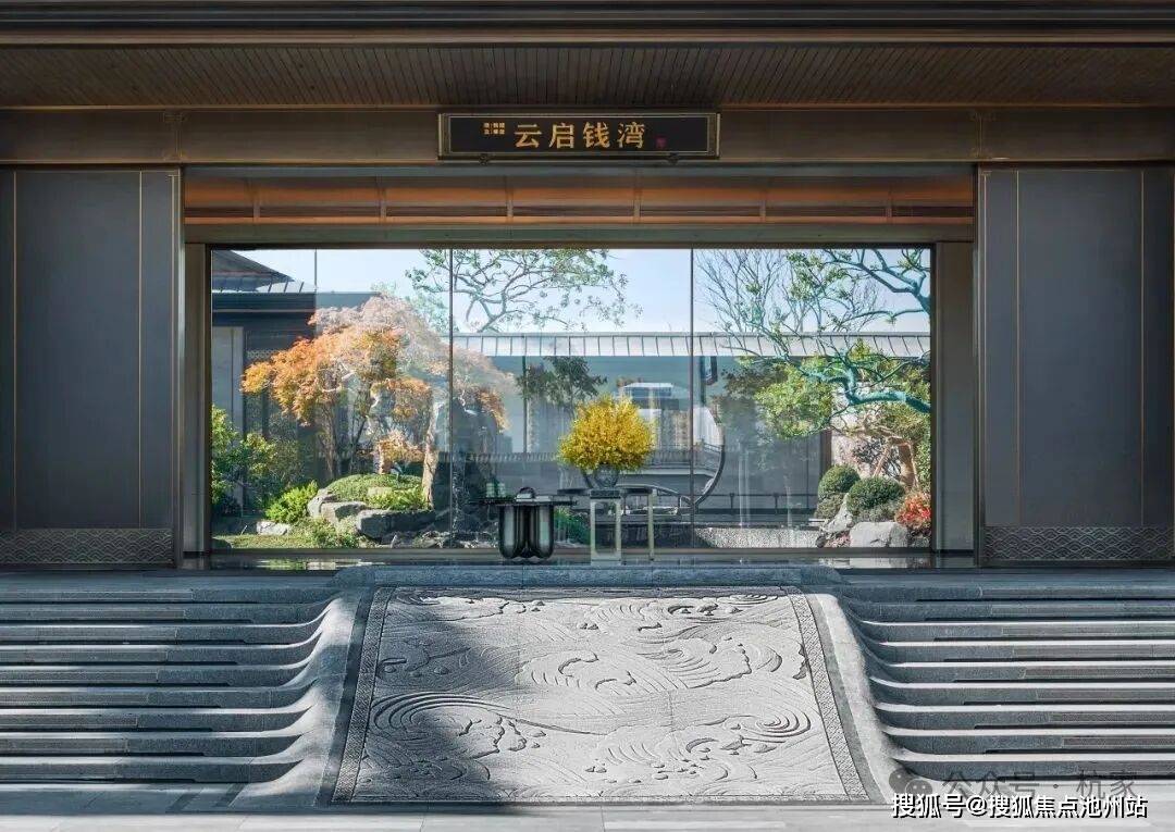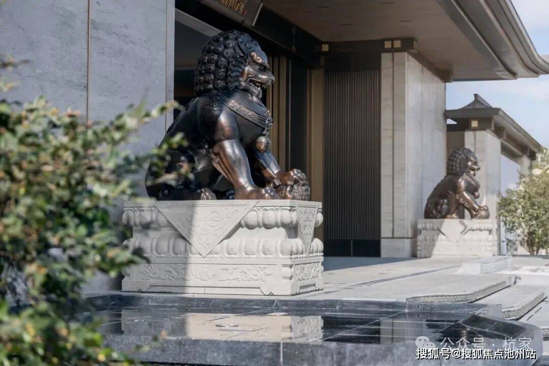 建发标志性的新中式大门:重檐悬山顶、一对约600斤的镇宅铜狮和登临而上的九级御道,开篇就是充满张力的大宅气场。