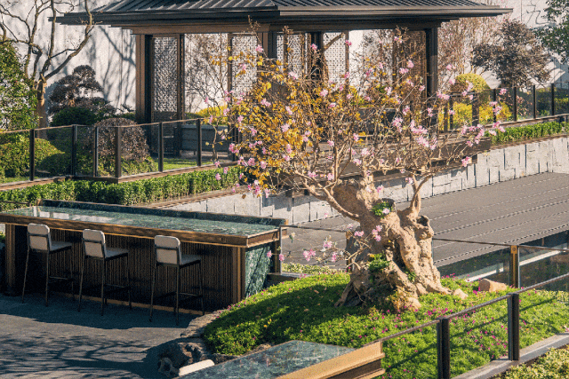 园区中央是建面约2000㎡的下沉式会所,墙面铺满中国黑石皮,与百年树木相呼应,散发着沉稳内敛的气场。